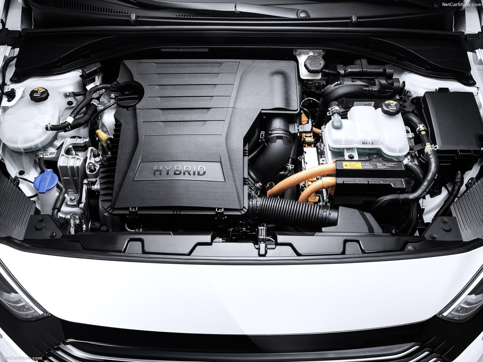 Let's take a moment to look under the hood of two of those cars, the IONIQ hybrid and the Kia Niro, as those models will be the hot sellers. Under that contemporary plastic cover is a small, 205-pound, 1.6 liter Hyundai Kappa III gasoline motor, and next to it, a 6-speed dual clutch transmission (DCT). In between the two is a 32 kilowatt (43HP) electric motor. Pretty fancy considering the gearbox is not a CVT. Oh, and there's no separate battery for the starter motor. One car, one lithium-ion battery pack.