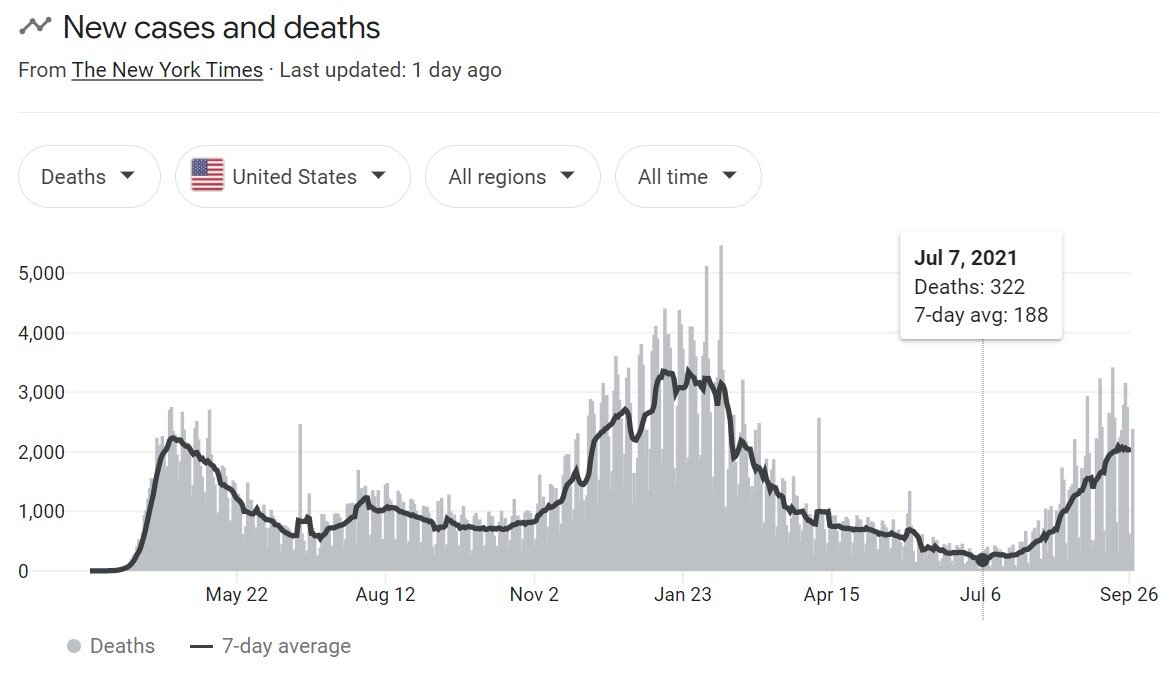 When I last posted on this blog, the US had the SARS-CoV-2 pandemic on the ropes. We were down to fewer than 300 deaths per day. Was it going to be that easy after nearly 18 months of suffering? Were we gong to end this pandemic?