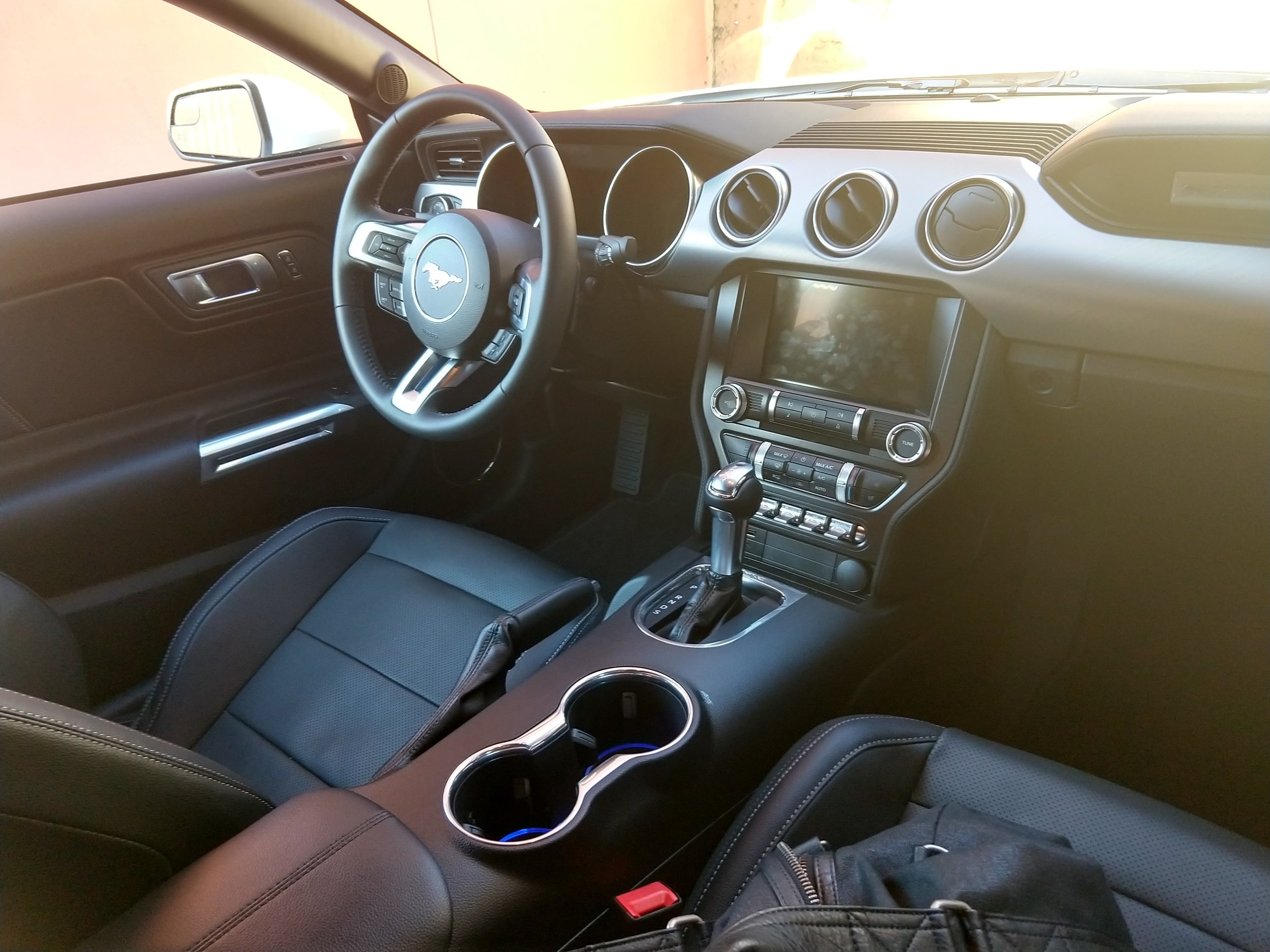 - The interior is not as slick as a BMW, but it’s so well put together. Form follows function. The audio system has two big dials that move with a satisfying notchy feel. The interior is ergonomic, comfortable, and is an updated version of the Mustang interior that has been with the car since its inception. The inside of the Mustang has never been better. I could drive for hors and hours in that bolstered seat. The continued availabilty of My Color, used to customize guage and interior ambient light color is a great bonus.