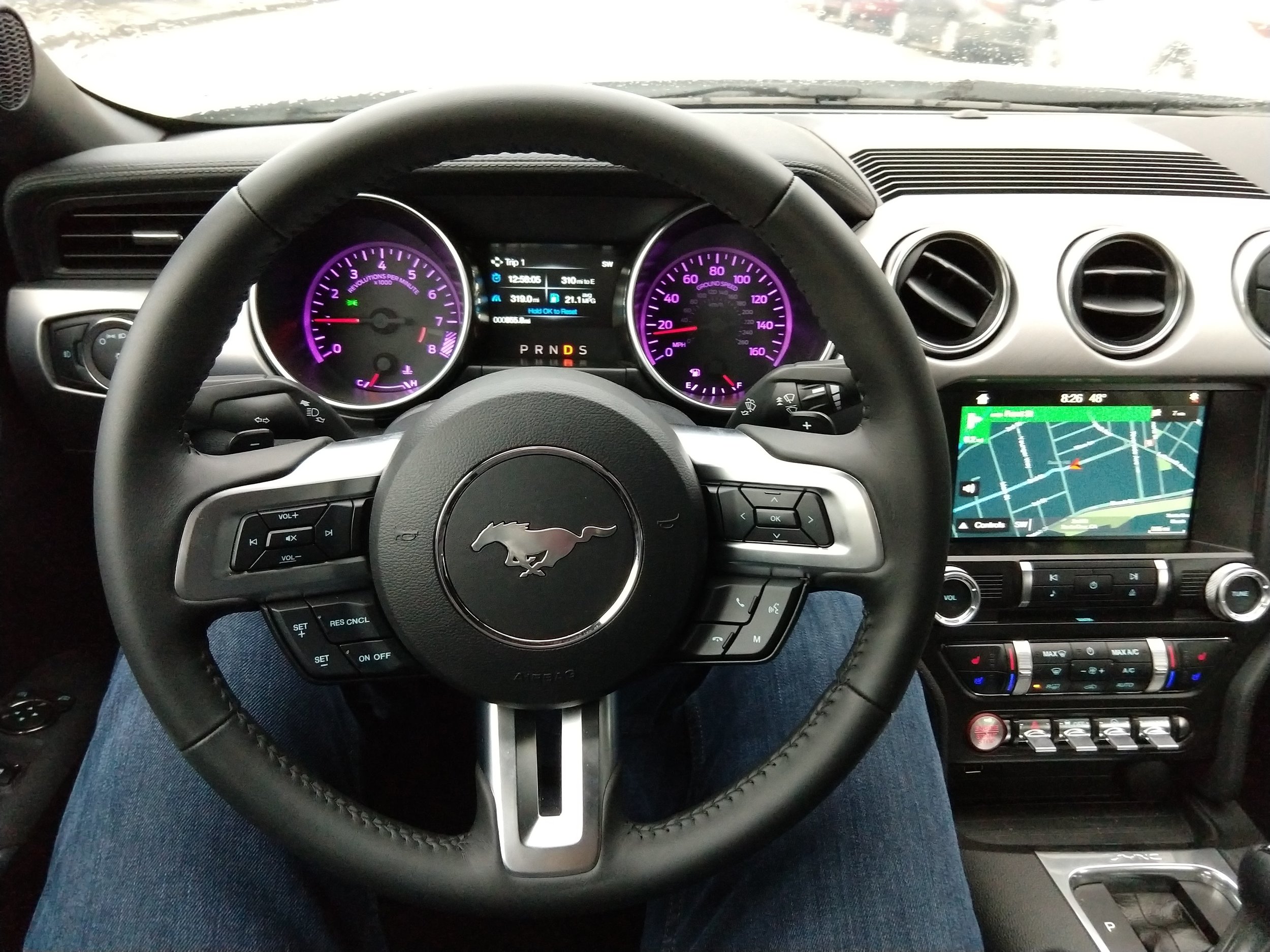 - The interior is not as slick as a BMW, but it’s so well put together. Form follows function. The audio system has two big dials that move with a satisfying notchy feel. The interior is ergonomic, comfortable, and is an updated version of the Mustang interior that has been with the car since its inception. The inside of the Mustang has never been better. I could drive for hors and hours in that bolstered seat. The continued availabilty of My Color, used to customize guage and interior ambient light color is a great bonus.