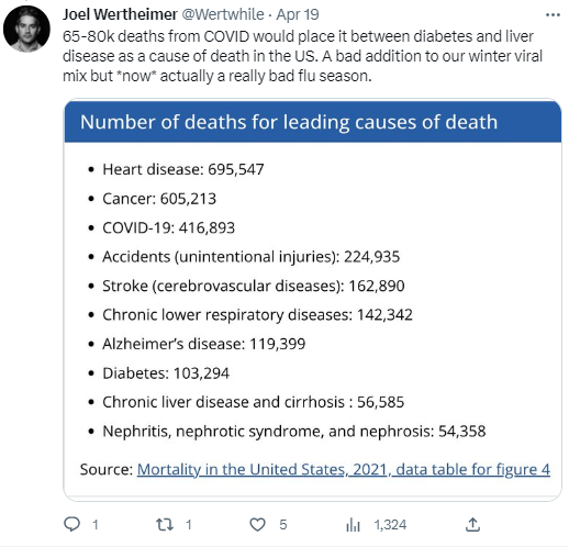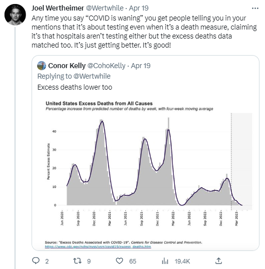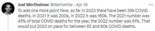 Correct! And I think Wertheimer knows this, but 80,000 respiratory infection deaths per year would, in normal times, be the worst flu season since the 1910s. However, this is the pandemic that we’re done with. We’re over it. Don’t wanna read or hear about it. We’re done. Which brings me to a tweet under his I didn’t want to cite, but now I’m angry: