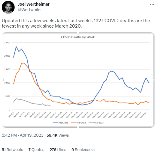 How can any scientist, doctor, public health professional or policymaker be satisfied with COVID-19 settling to become the third leading cause of death? Let’s suppose, in an alternate history, we were dealing with COVID-19 for decades. It would still present as a big problem each winter when Americans socialize indoors. We would have elected leaders and scientists telling us to get vaccinated each fall to reduce the risk of death. How many Americans recognized that and got a booster last fall? Oh, about 18%, plus or minus. We went from nearly 80% vaccinated in early 2021 to under 20% vaccinated for the winter of 2023. Like a film that sees a huge drop in box office revenue in its second week, the vaccines are no longer desired. And now the US is stuck in this unnecessary vulnerable position with people socializing indoors each winter, assuming they never have to get another shot for this disease. They are done with it. Wertheimer added: