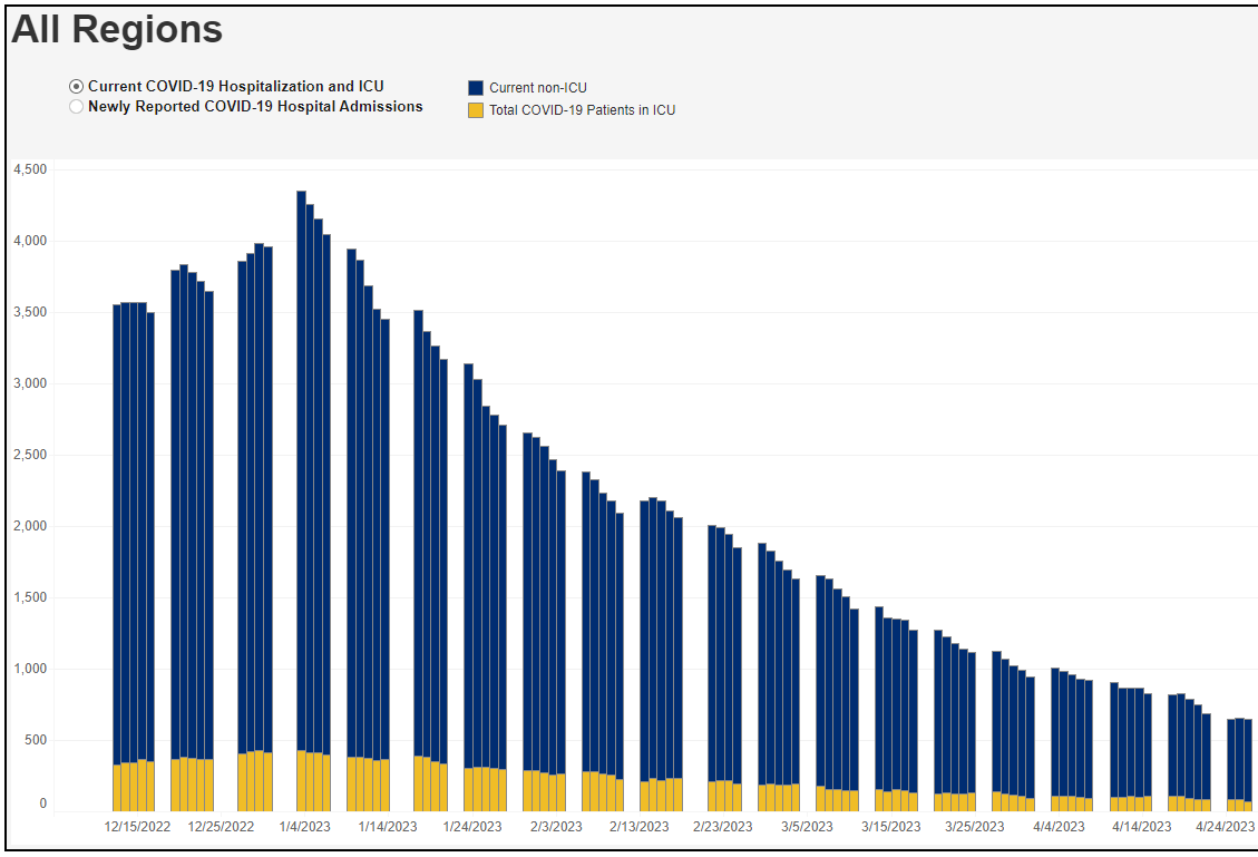 And this too, is objectively good news. New York state hasn’t had fewer than 100 patients in the ICU since July 2021. This is a near record low. But it’s accurate and relevant to point out that before the pandemic, if we saw 72 patients in state ICUs with Influenza in April, we would say that this is a harsh flu season.