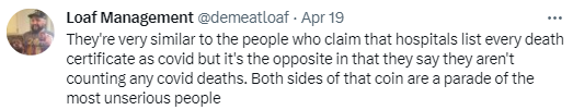 But, sure. Yes, Twitter user Loaf Management, we who follow the science are just as bad as those who claimed that the pandemic was being exaggerated, embellished and used to scare the public for whatever reasons the anti-semitic conspiracy cultists could think of.