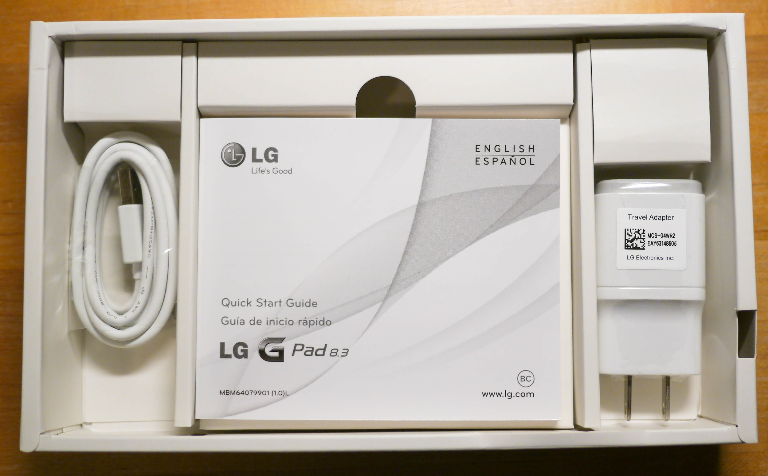 LG keeps it simple. The box has the tablet, a universal Android micro USB charger, and a manual most users will never read.