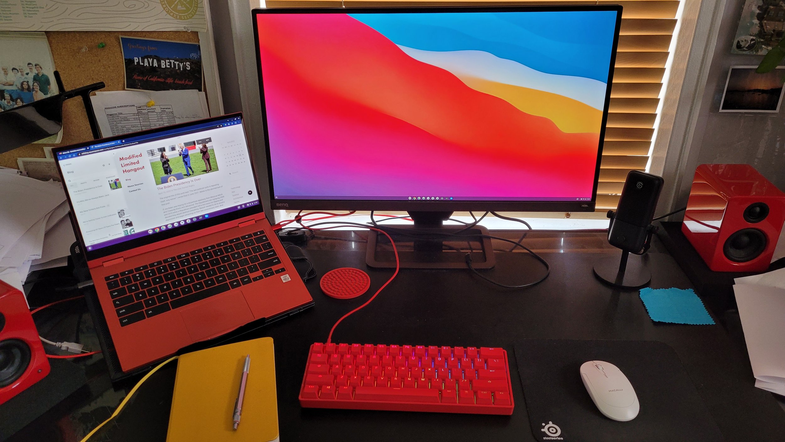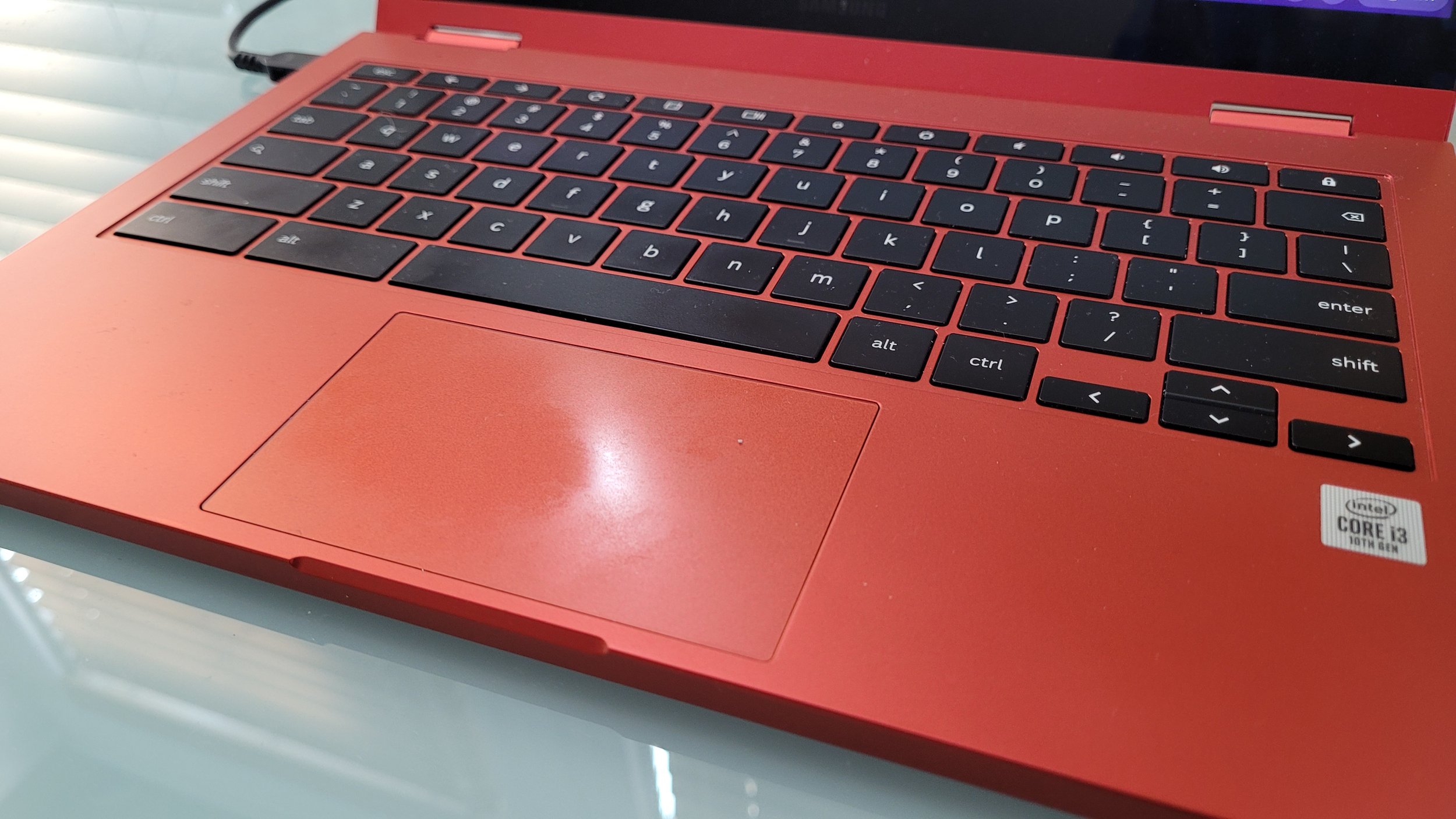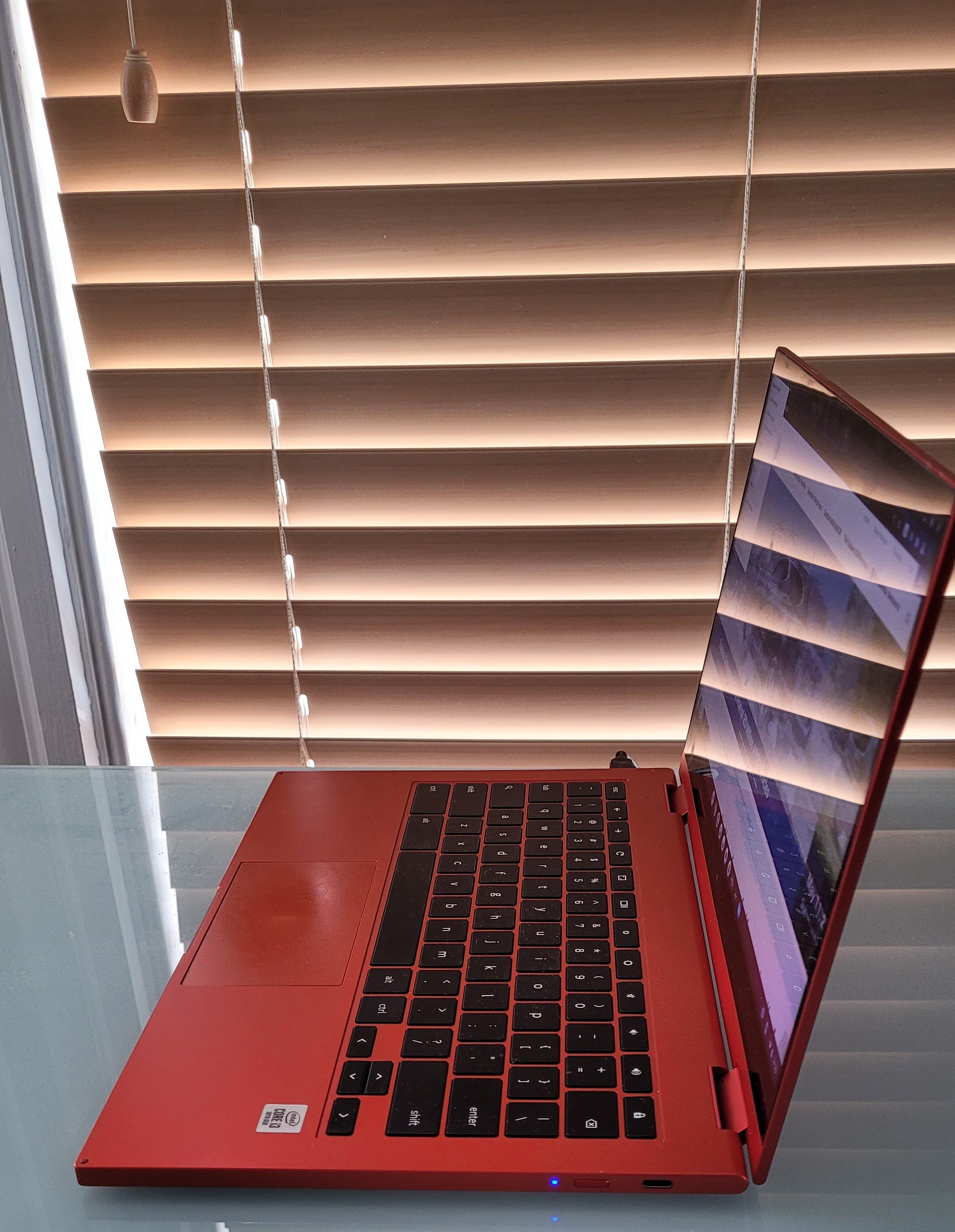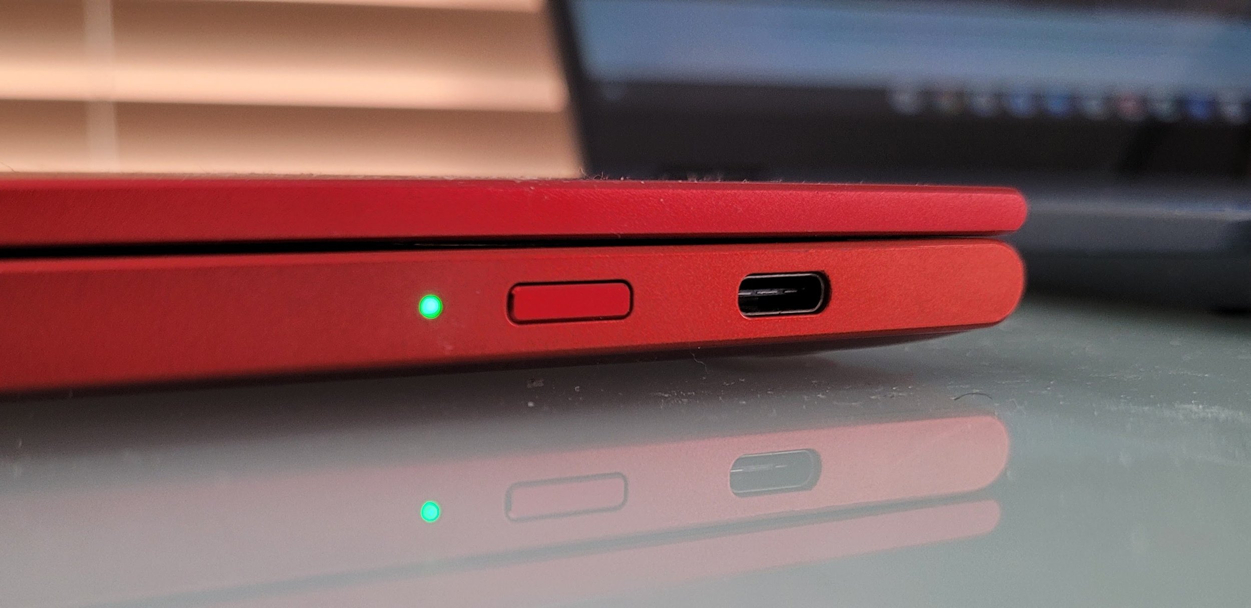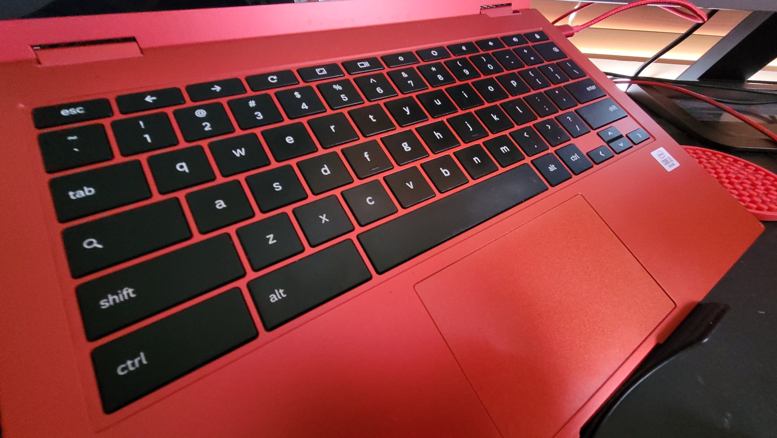 - The aluminum hinges are fine, but they highlight something that bugs me: the upper and lower halves of the clamshell are different case materials with different weights. The display is wrapped in beautifully engineered red aluminum. The lower half of the device is the same red color, but in slightly flexible plastic. That doesn’t bother me when this device is connected to an external mechanical keyboard. In that mode, this Chromebook is essentially a second monitor or a docked Chromebox. But on my lap, it feels so unbalanced. The heavier, cold metal display half is held up over a warmer, lighter keyboard and motherboard half. In terms of feel, it doesn’t work when sitting in your lap. It feels like two different devices joined together. That makes it a desk machine only in my mind.